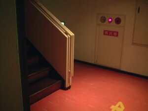 四階エレベーターを降りて右手の当店入り口に至る廊下は約2m幅のゆったりとした通路で入り口ドア右手は二十四時間体制で管理人が常駐するビル事務所。左手は直ぐにゆったり広々とした障害物ひとつない非常階段に通じています。
